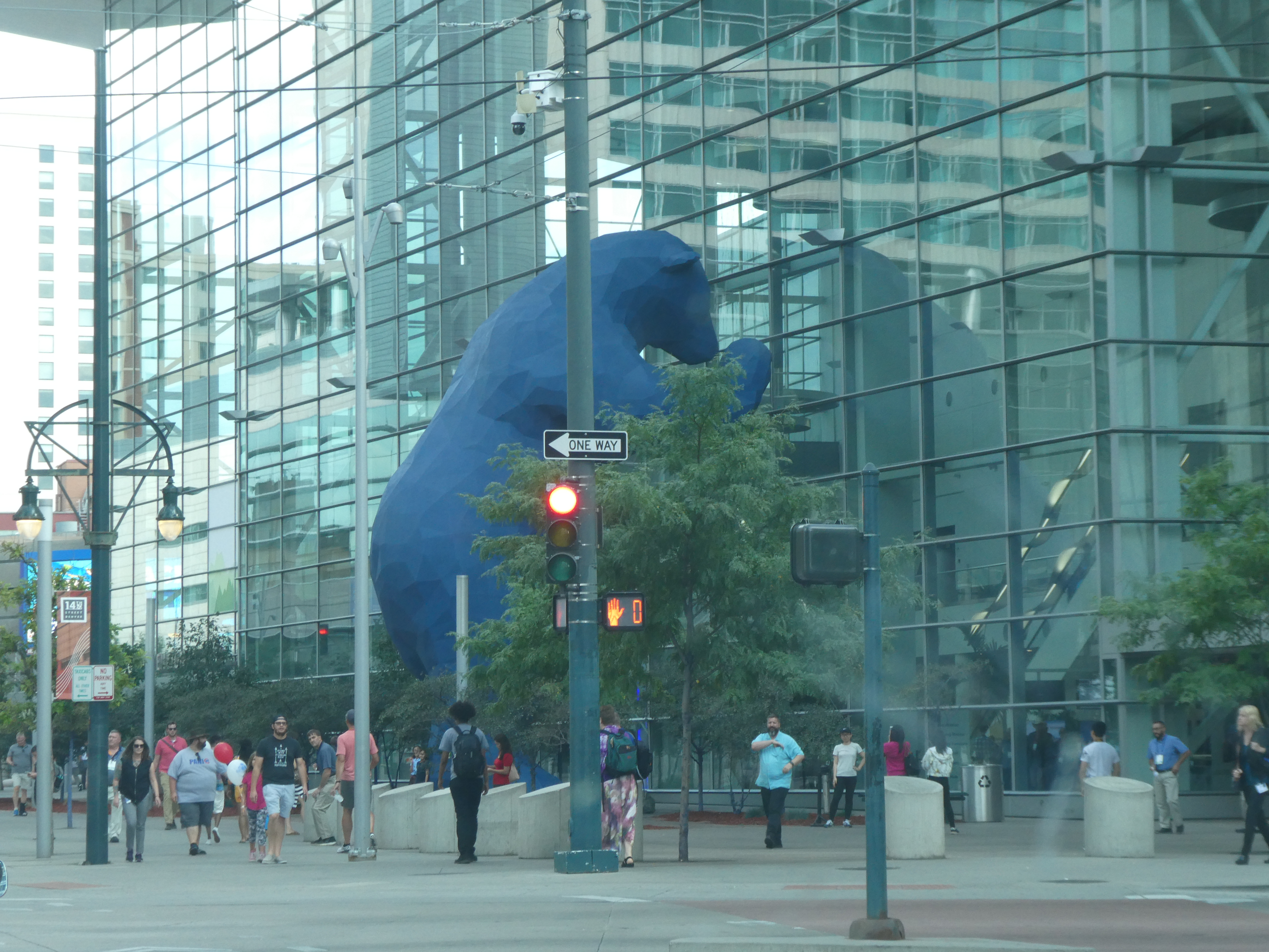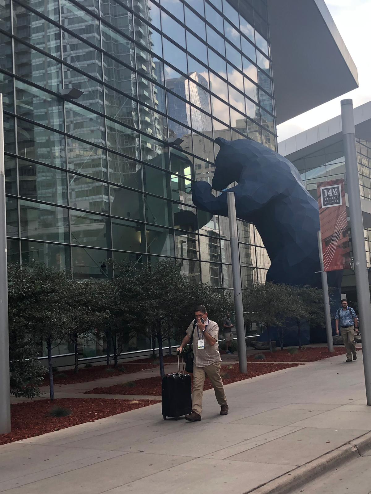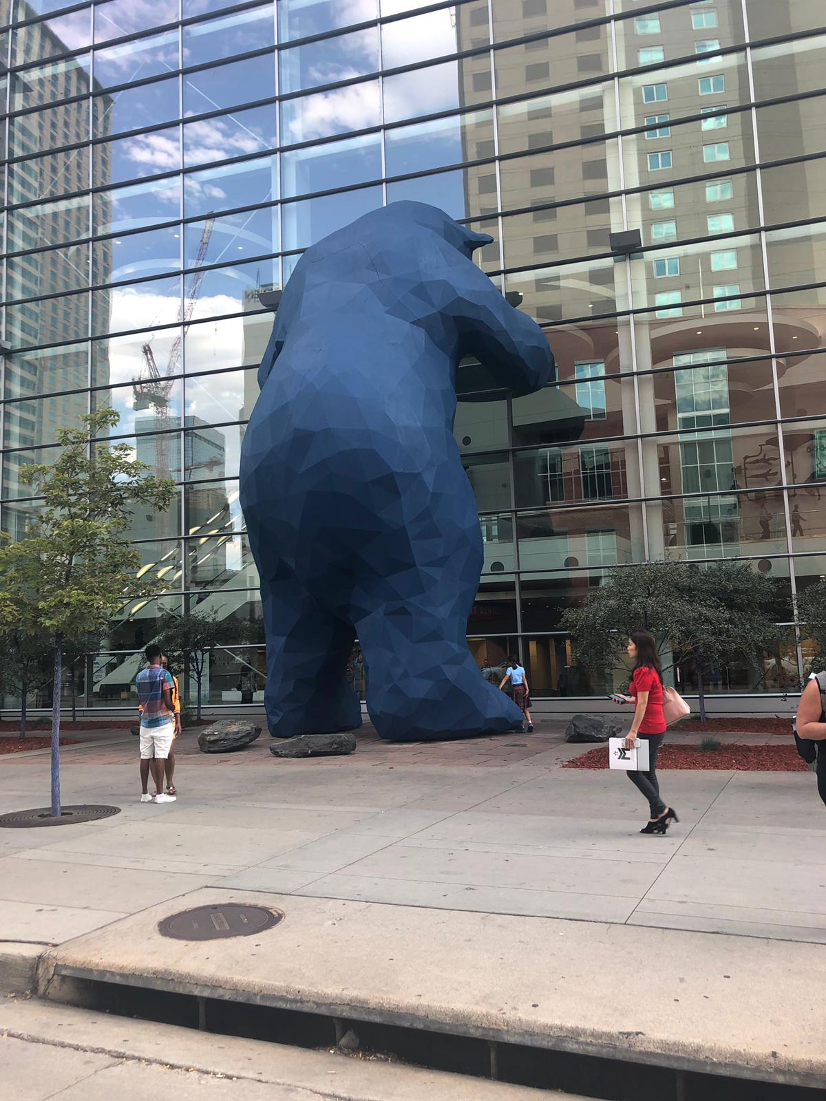 Io trovo quello che cercavo e dò quindi degna sepoltura alle mie compagne di tante camminate, (riabilitazioni in palestra, ecc.) nel secchione della spazzatura che sta nel parcheggio antistante il negozio Nike. Scatto anche la foto da apporre sulla lapide… Raggiungiamo loro in centro, al famoso 16th Street Mall, una strada chiusa al traffico, quindi solo pedonale, teoricamente paradiso dello shopping e di tranquille passeggiate. Il tempo stringe e noi non facciamo in tempo neanche a scendere, ma solo a girare 5-6 blocks in macchina (vediamo il famoso Blue Bear, una installazione artistica molto particolare); loro, che la passeggiata sono riusciti a farla, ci raccontano di aver incrociato un numero impressionante di homeless e di avere avuto la sensazione di una enorme povertà diffusa.