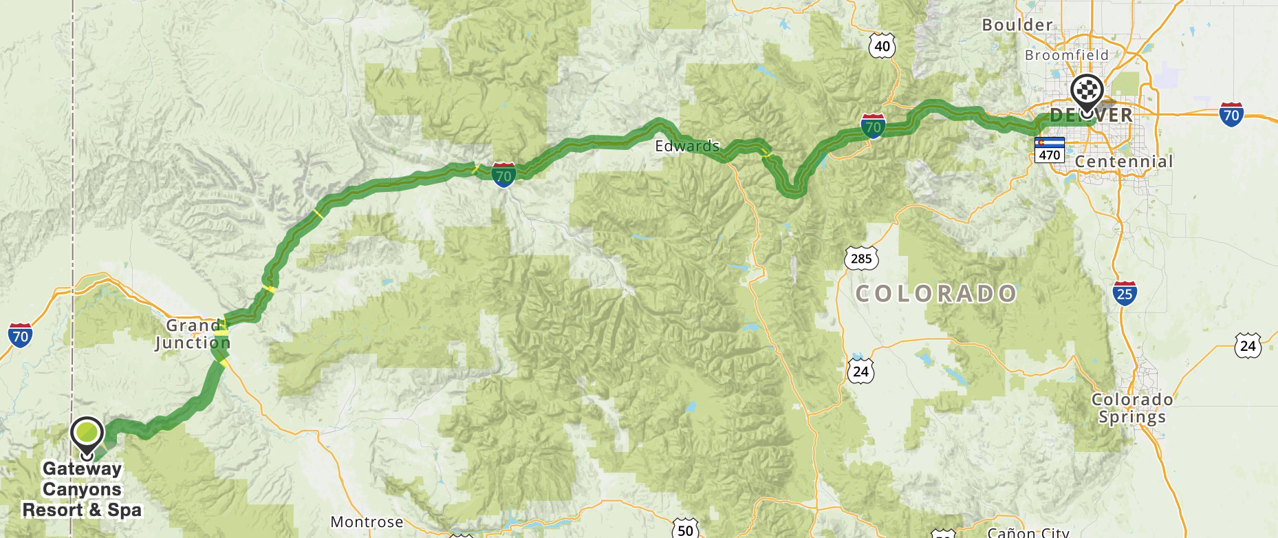 LUNGO TRASFERIMENTO – in realtà a Denver andiamo solo perchè è la città più vicina (relativamente!) a Gateway, e da qui possiamo spiccare letteralmente il volo, la mattina successiva, presto. Iniziamo percorrendo la CO 141 per circa 1 ora (55 miglia), in un totale black out informatico e telefonico, fino alla città di Grand Junction. Da qui proseguiamo sulla I70 verso Denver. In totale percorriamo 290 miglia (circa 500km) in 5 ore. Un’eternità !